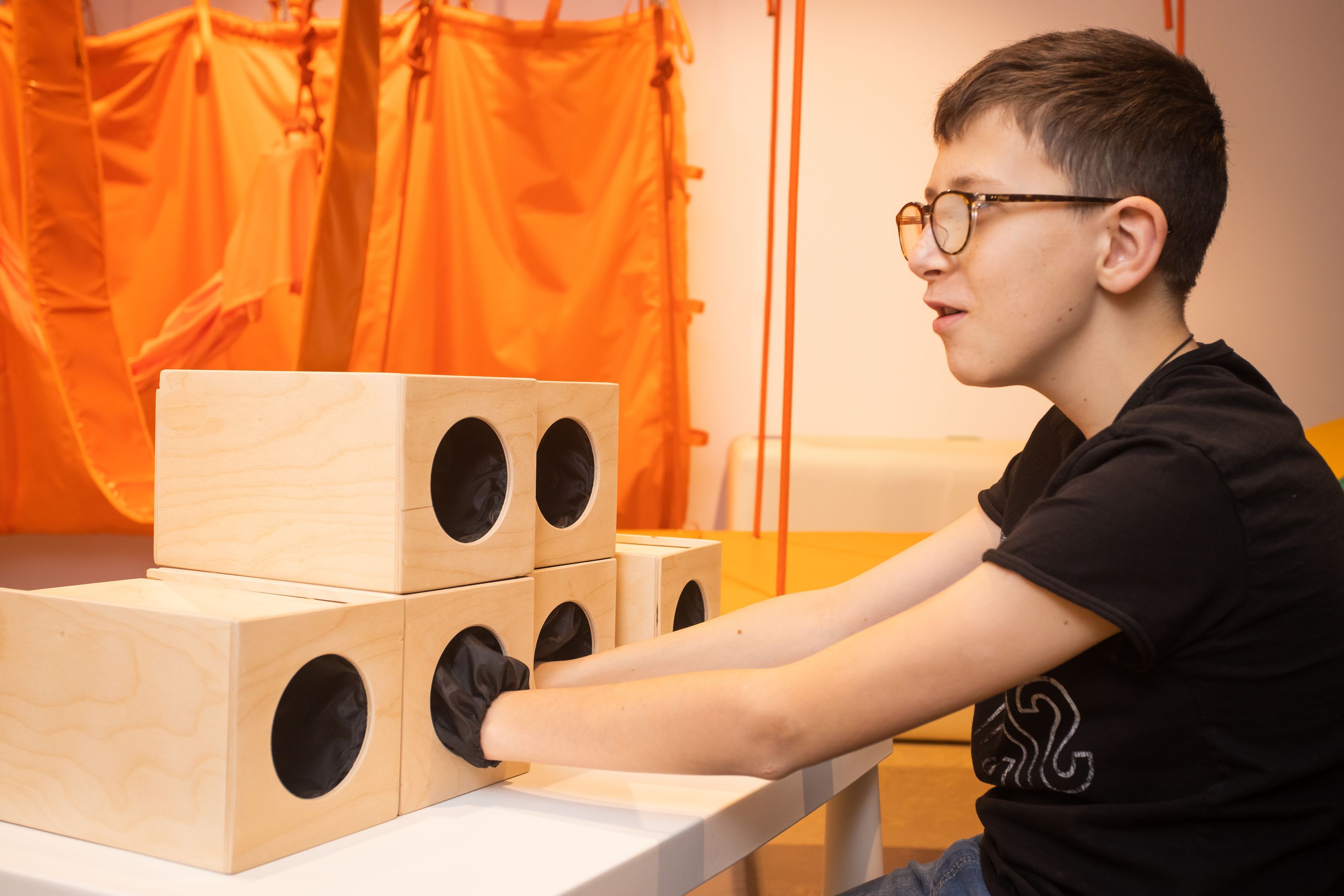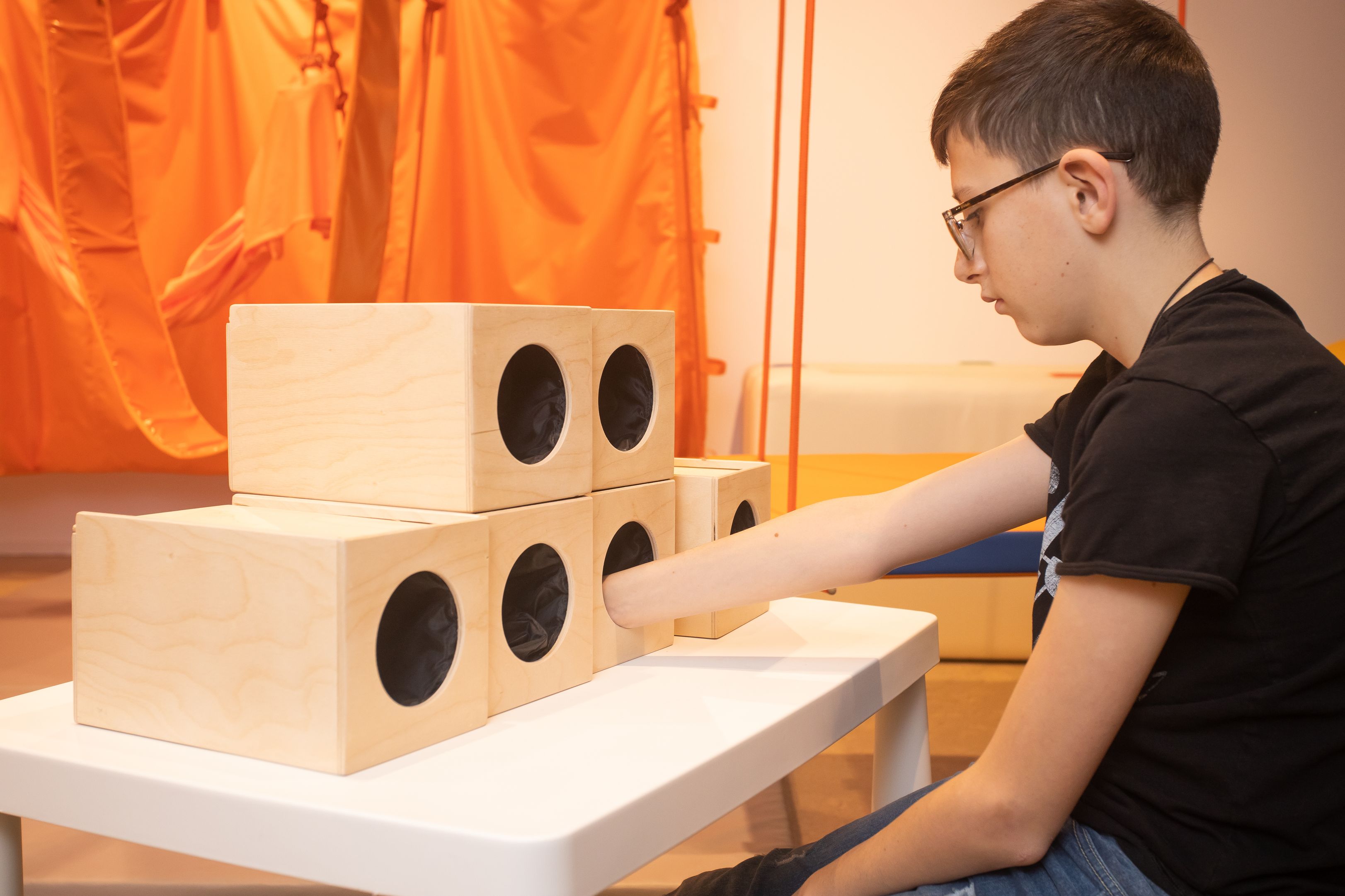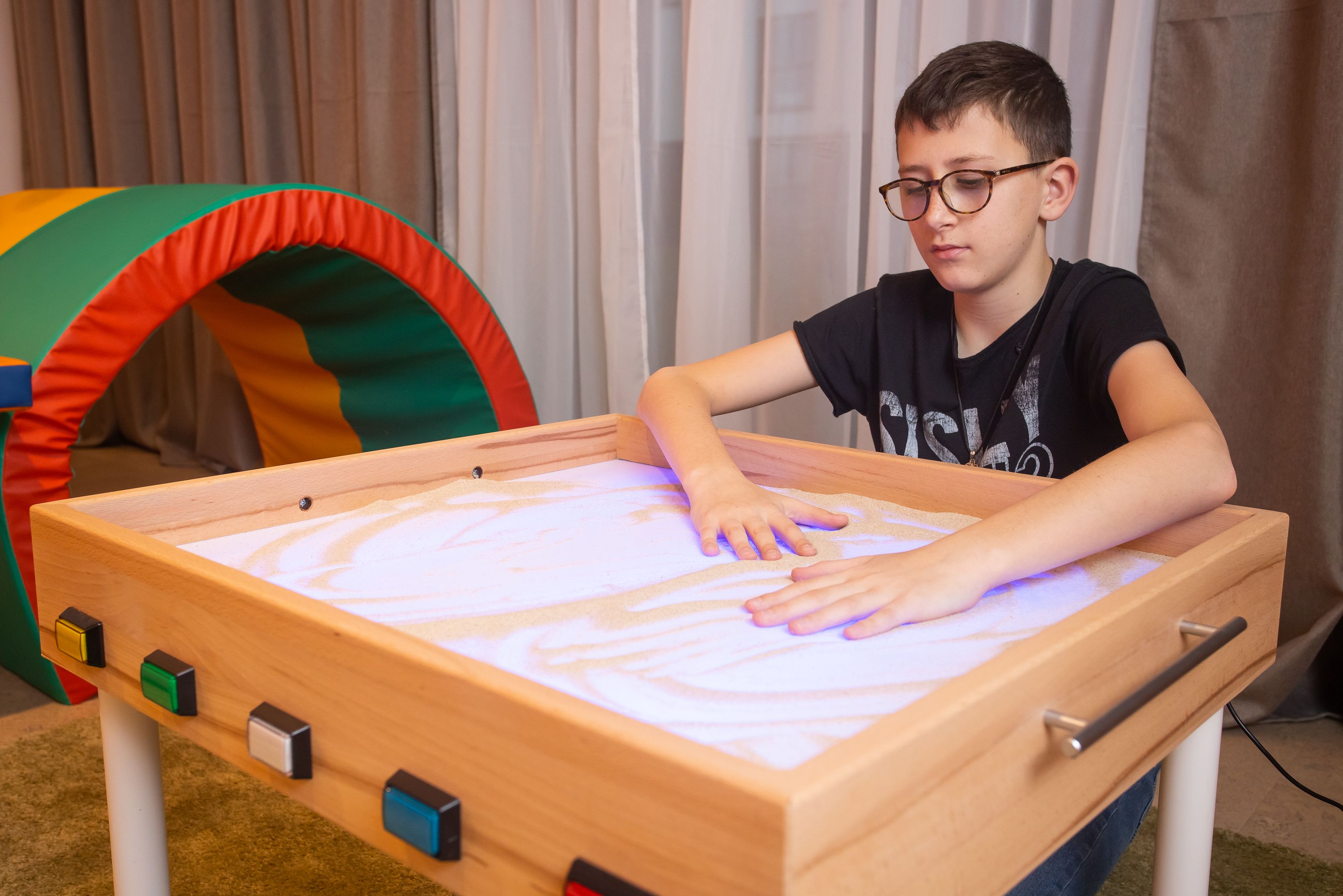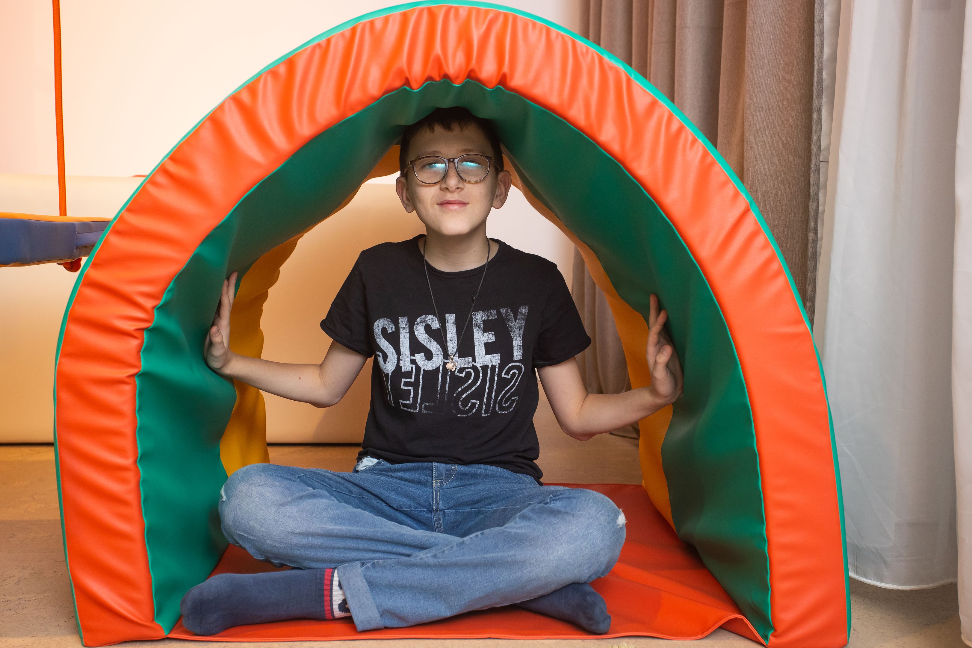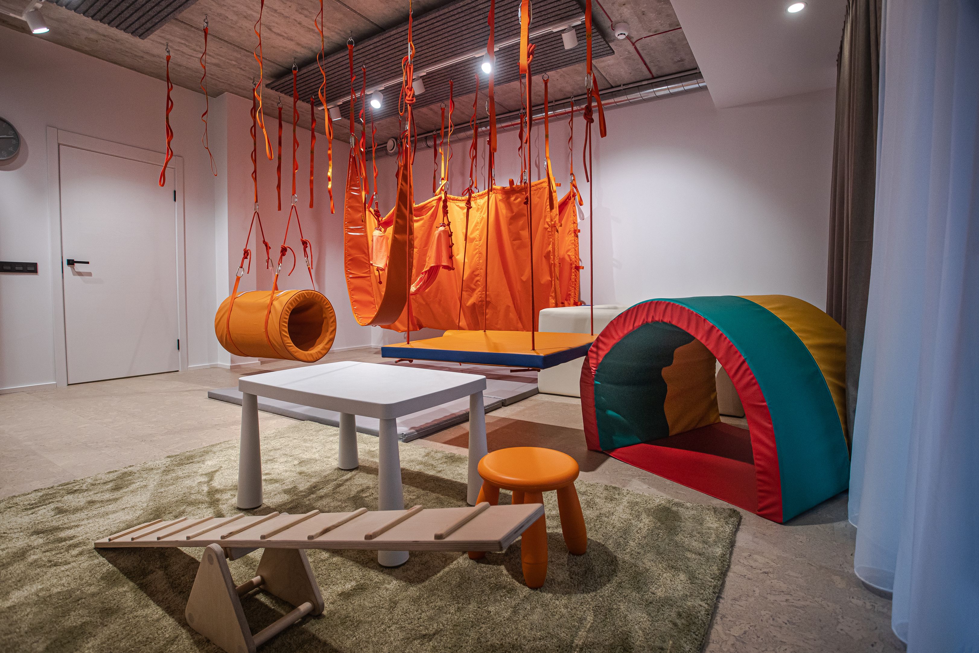 - Tunelis – didžiulis audinys, leidžiantis vaikams saugiai patirti judėjimą labai nestabiliu paviršiumi. integruojant informaciją iš vestibuliarinės, regos ir motorinės sistemos. Taip pat, formuoja vaiko kūno dalių santykinės padėties ir jų judėjimo pojūtį. kitaip tariant, atsiranda savo kūno jautimo suvokimas. Šis treniruoklis yra būtinoji priemonė bet kurioje dinaminio jutimo patalpoje.